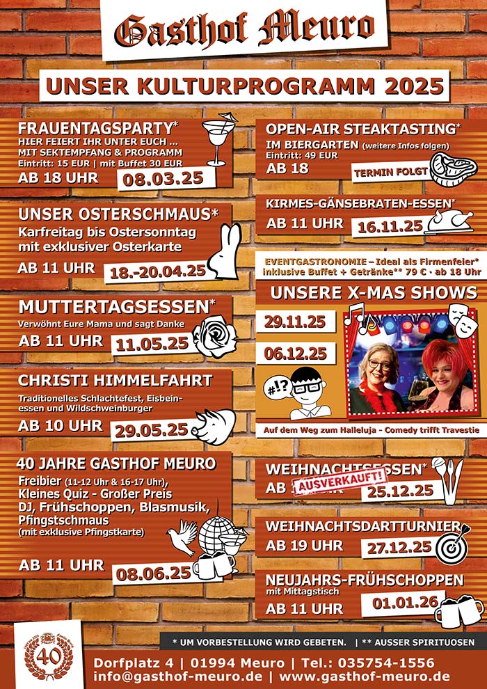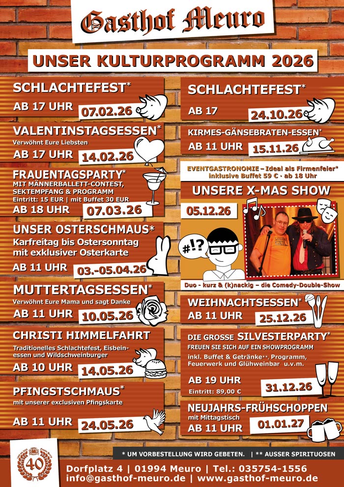 Der Gasthof Meuro ist Ihr Partner, wenn es um Eventgastronomie geht. Unsere Veranstaltungen sind ideal, um Ihrem Firmenevent oder Ihrer Unternehmensfeier einen passenden Rahmen zu geben.